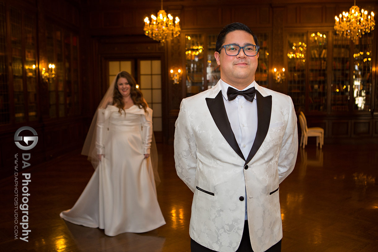 While Erika was finishing up Kelly’s photos, I wrapped up with Phil and took him to the library, where they planned to have their first look right in front of one of those big windows. As Phil waited for Kelly, I went to check on her progress. It was perfect timing because Kelly was about to do a reveal with her dad and brother. Erika and I captured that, and then I headed back down to be with Phil.
