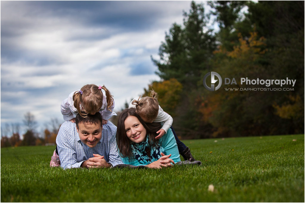 As the sky started to darken and we were losing light in the forest, we headed up to the soccer field. The wide open space offered a perfect canvas to have some fun with the family. After the parents had played with the girls and lost their inhibitions, I had them lay down on the grass. Once they were in position, I told the girls to climb on top of them much to their excitement. This simple composition was so natural and showcased their close bond without the need for props or set ups.