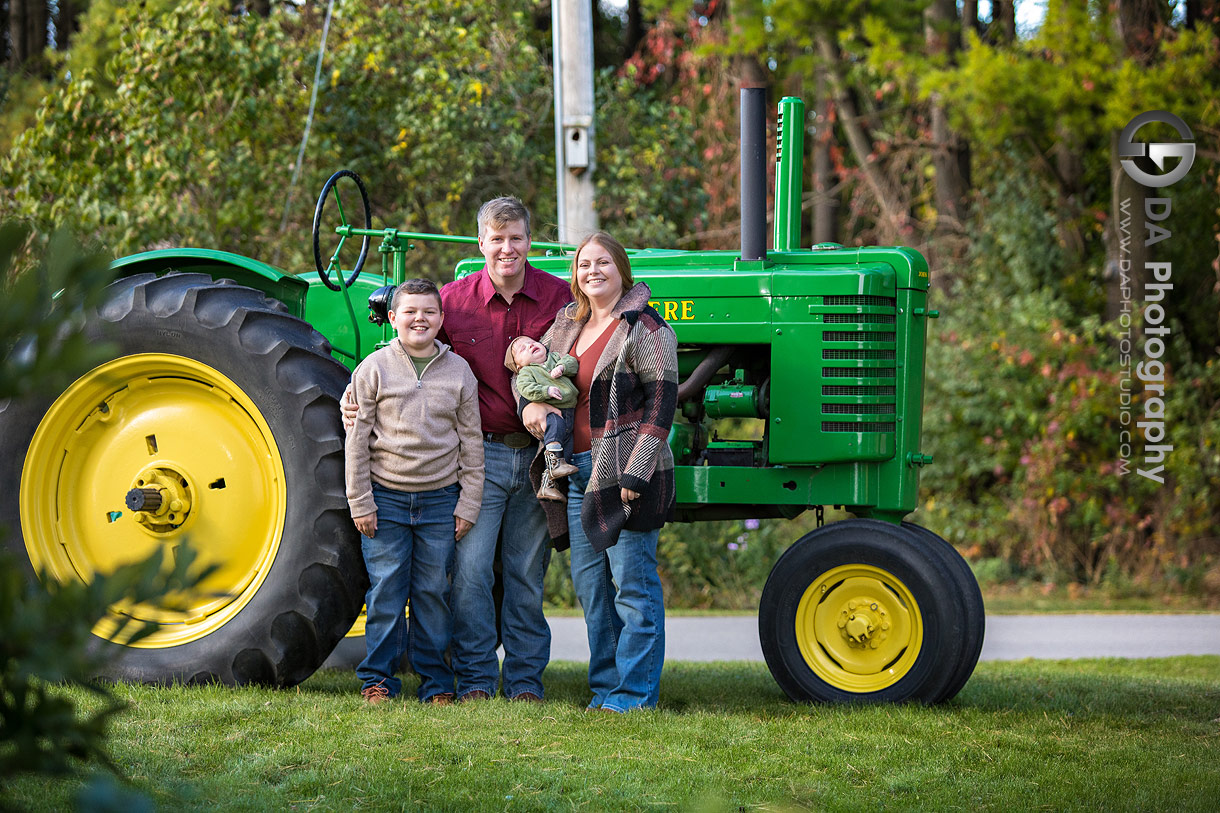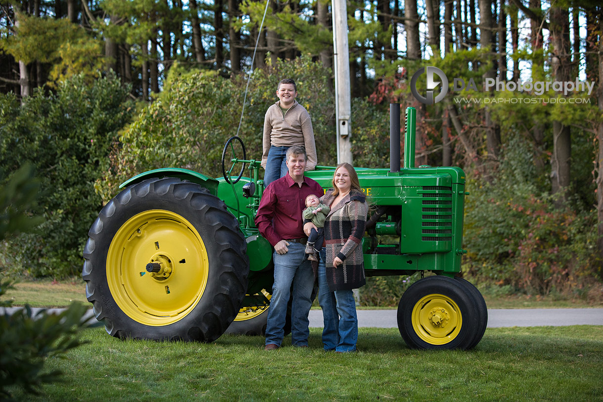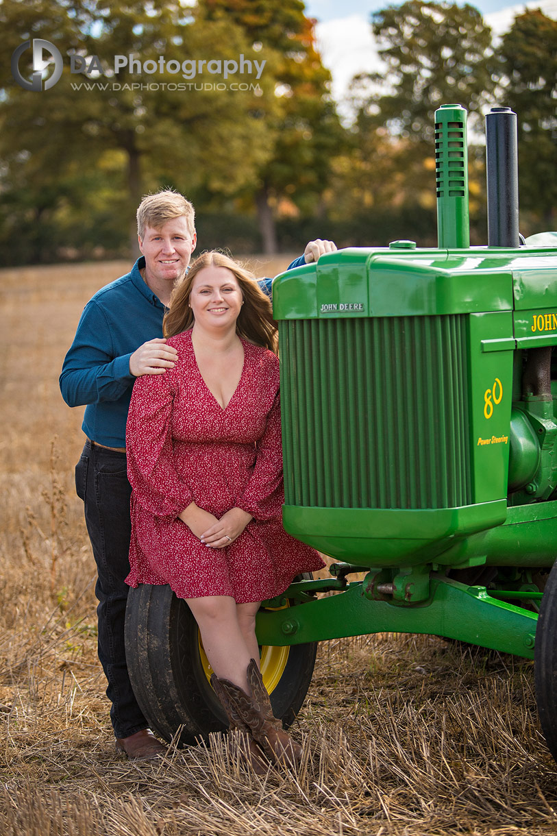 I was excited for the second part of their session, especially with the breathtaking field that featured a tractor parked in the middle. Behind it, a grand tree stood tall, framed by a vibrant forest glowing in autumn colours—a perfect reminder of why fall photos in Canada are among the most stunning in the world.