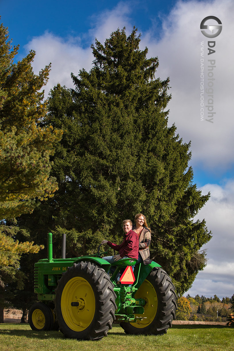 Eventually, we made our way to the green tractor parked near the house, and I began photographing them there. The vibrant blue sky against the green tractor made the colours in their farm engagement photos pop even more beautifully than I had hoped.