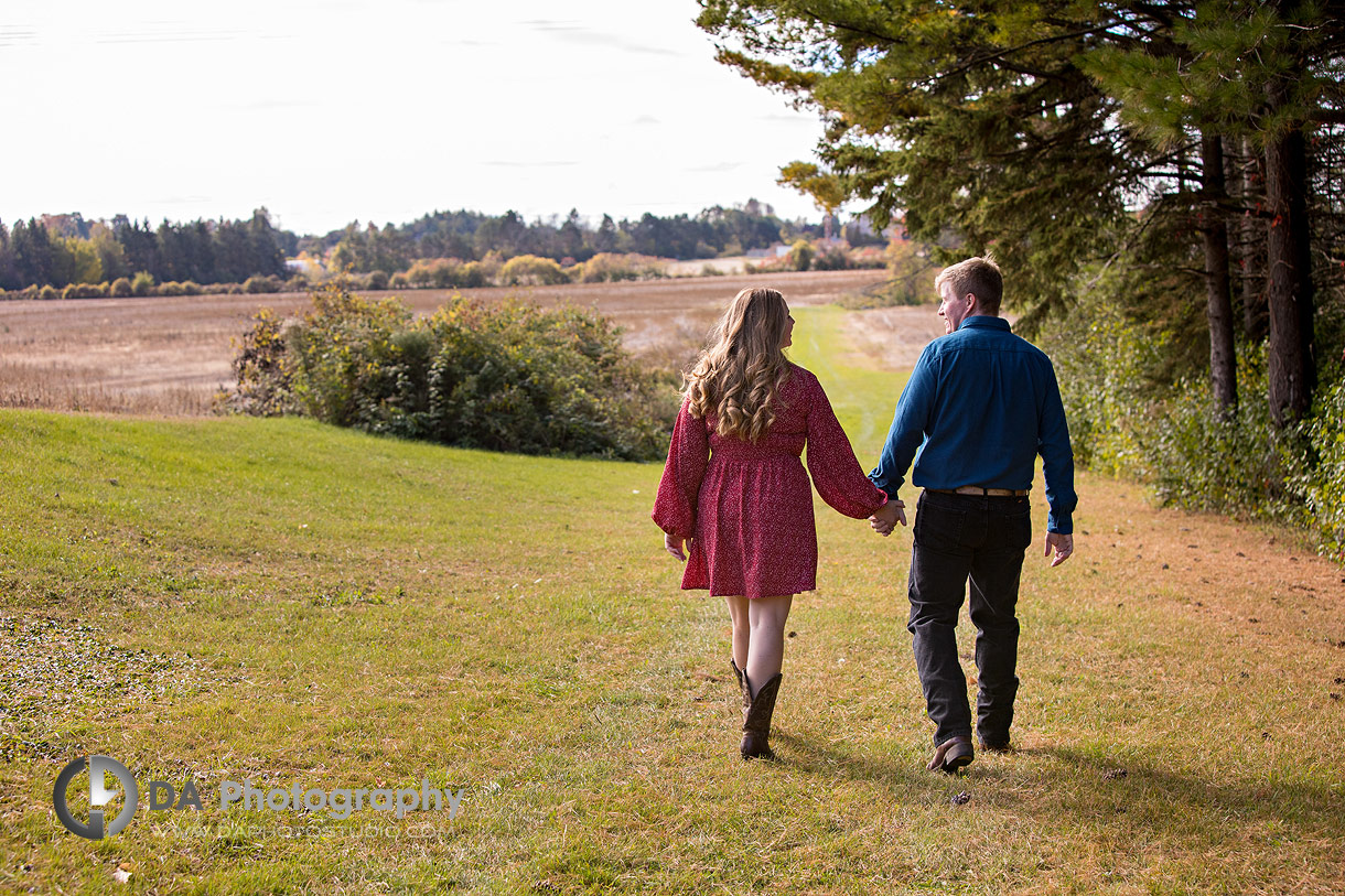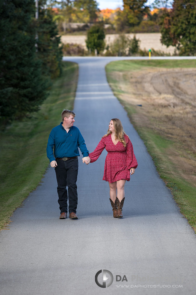 Standing near the top of the road close to their house, I asked Heather and Zach to walk away from me along their driveway and simply interact with each other. This gave me the perfect opportunity to frame them in the center of the shot, with the winding road stretching out behind them, leading toward the vibrant fields, trees, and nearby farms in the distance.