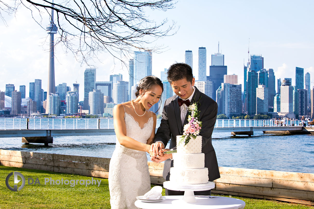 I don’t know if I have ever witnessed a more stunning backdrop for cake cutting than at Jess and Monty’s wedding. The beautiful cake was displayed against a gorgeous backdrop of the lake and the city of Toronto in the background. Jess and Monty cut their cake and gave a heartfelt speech that was perfect for the occasion. After thanking their guests for coming, they invited them to take some photos and enjoy the drinks with the wedding cake.