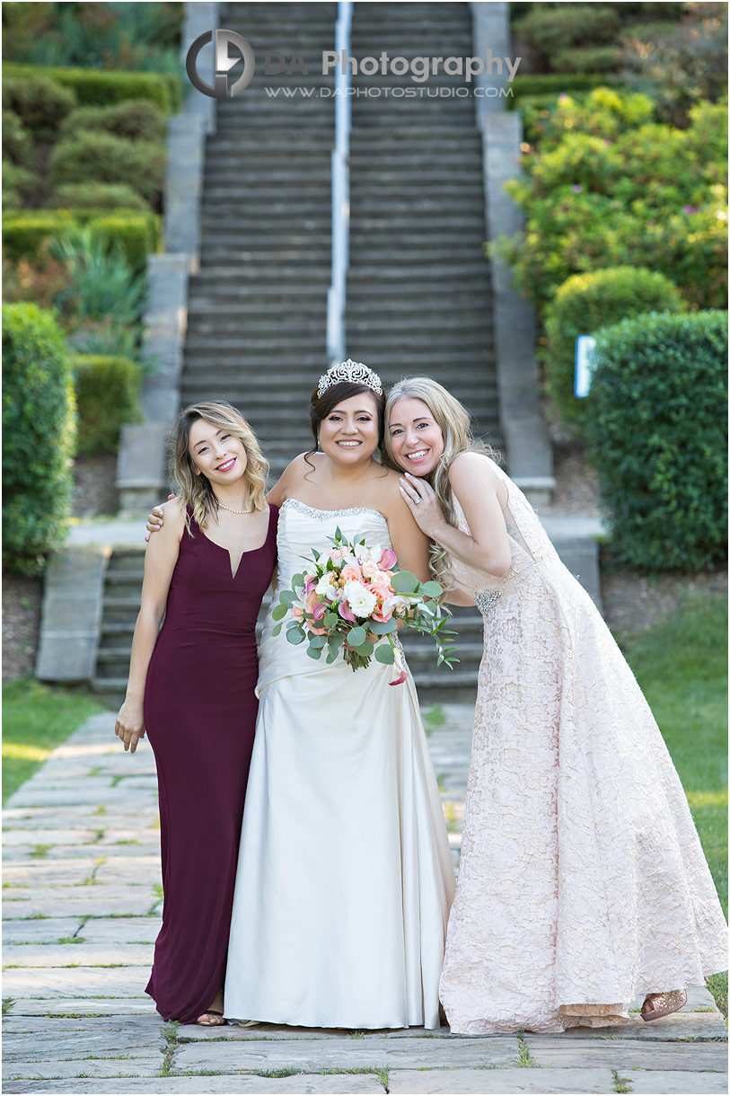 First, we wrapped up the family photoshoot in the grounds. Next, I jumped in the limo with the wedding party to the Battlefield Museum. One of the beautiful things as a Stoney Creek wedding photographer is being able to show people what is on their doorsteps. Known for our abundance of waterfalls, there are so many other equally attractive options when it comes to photographic locations. The age of the building and the long set of steps offer such a powerful and dramatic look. The angle of the steps makes it a perfect setup to show off the back of the wedding dress. At the same time, the lines of the structures and vibrancy of the greenery complete the look.